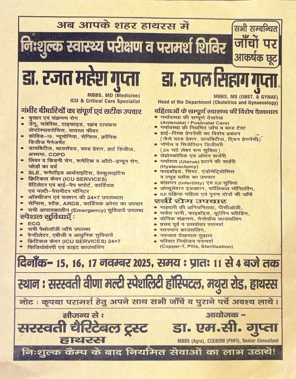 हाथरस 14 नवम्बर । हाथरस में सरस्वती चैरिटेबल ट्रस्ट द्वारा 15, 16 और 17 नवंबर 2025 को निःशुल्क स्वास्थ्य परीक्षण एवं परामर्श शिविर का आयोजन किया जा रहा है। यह शिविर शहर के मथुरा रोड स्थित सरस्वती वीणा मल्टी स्पेशलिटी हॉस्पिटल में प्रातः 11 बजे से शाम 4 बजे तक संचालित होगा। स्थानीय नागरिकों को बेहतर स्वास्थ्य सुविधाएँ उपलब्ध कराने के उद्देश्य से आयोजित इस शिविर में शहर के ख्यातिप्राप्त चिकित्सक अपनी सेवाएं प्रदान करेंगे। इस शिविर में डॉ. रजत महेश गुप्ता (ICU एवं क्रिटिकल केयर विशेषज्ञ) गंभीर और दीर्घकालिक बीमारियों का उपचार करेंगे। वे बुखार, वायरल संक्रमण, टाइफाइड, डेंगू, मलेरिया, कोविड-19, न्यूमोनिया, सीओपीडी, अस्थमा, डायबिटीज, थायरॉयड, ब्लड प्रेशर, हृदय, किडनी और लीवर रोगों के साथ-साथ आईसीयू से संबंधित आधुनिक सुविधाओं जैसे वेंटिलेटर, मॉनिटरिंग, इमरजेंसी केयर और ECG जांच उपलब्ध कराएंगे। दूसरी ओर, डॉ. रूपल सिहाग गुप्ता (स्त्री एवं प्रसूति रोग विशेषज्ञ) महिलाओं के संपूर्ण स्वास्थ्य से जुड़ी सेवाएं देंगी। इनमें गर्भावस्था की देखभाल, अल्ट्रासाउंड, आवश्यक रक्त जांच, नॉर्मल व सिजेरियन डिलीवरी, हाई-रिस्क प्रेग्नेंसी का उपचार, फाइब्रॉइड, सिस्ट, मासिक धर्म संबंधी समस्याओं का समाधान और परिवार नियोजन सेवाएं शामिल हैं। आयोजकों ने शिविर में भाग लेने वालों से अनुरोध किया है कि वे अपने स्वास्थ्य से संबंधित पुराने सभी दस्तावेज साथ लेकर आएं, ताकि डॉक्टरों द्वारा बेहतर परामर्श दिया जा सके। आयोजनकर्ता डॉ. एम.सी. गुप्ता ने बताया कि निःशुल्क शिविर के बाद भी नियमित सेवाओं का लाभ लिया जा सकता है। शिविर में सभी जांचों पर आकर्षक छूट मिलेगी। बतादें नगर के प्रमुख चिकित्सक डा एमसी गुप्ता के होनहार सुपुत्र डा रजत महेश गुप्ता व पुत्र वधु डा रूपल सिहाग गुप्ता ने सरस्वती वीणा मल्टी स्पेशलिटी हॉस्पिटल में रोजाना ओपीडी शुरू कर दी है।