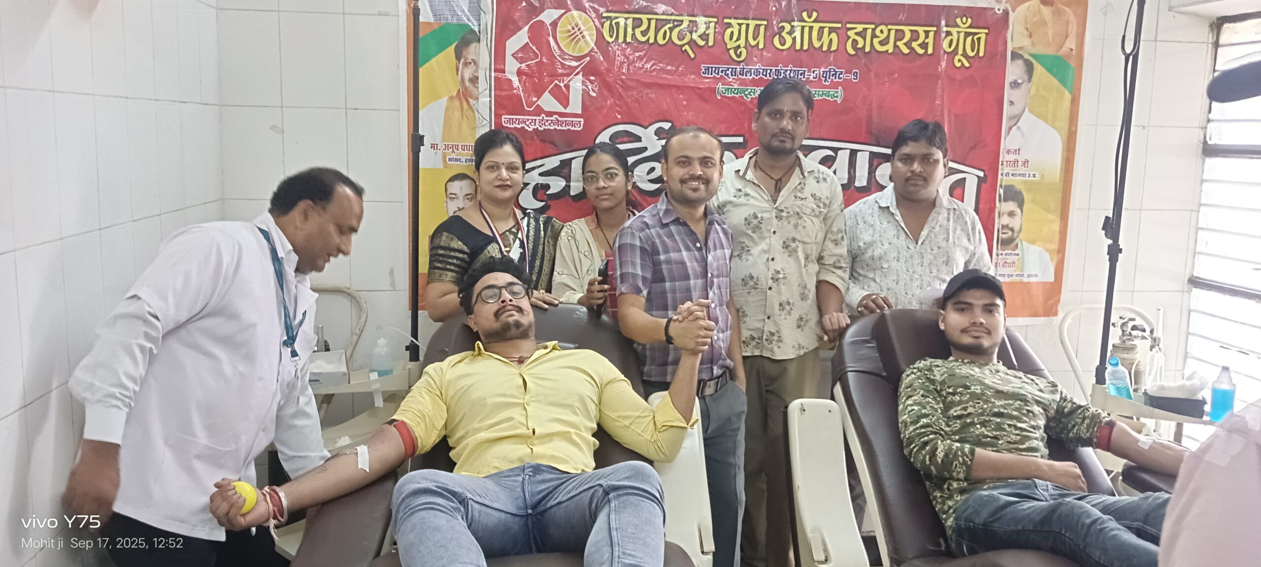 हाथरस 19 सितंबर । जायंट्स सेवा सप्ताह के अंतर्गत, माननीय प्रधानमंत्री श्री नरेंद्र मोदी के जन्मदिवस के अवसर पर जायंट्स ग्रुप ऑफ हाथरस “गूंज” ने समाज सेवा की दिशा में सराहनीय पहल की। शिविर में 14 रक्तदाताओं ने उत्साहपूर्वक रक्तदान किया और “रक्तदान महादान” का संदेश आमजन तक पहुँचाया। रक्तदान शिविर का उद्घाटन जिला प्रभारी और प्रदेश मंत्री श्री डी. पी. भारती ने किया। मुख्य अतिथि के रूप में हाथरस सांसद अनूप प्रधान, हाथरस विधायक अंजुला माहोर और हाथरस भाजपा जिला अध्यक्ष शरद महेश्वरी उपस्थित रहे। सभी अतिथियों का पटका पहनाकर और स्मृति चिन्ह देकर स्वागत किया गया। रक्तदान का महत्व बताते हुए आयोजकों ने कहा कि यह एक ऐसा दान है जो सीधे जीवन बचाता है। सभी रक्तदाताओं को उपहार स्वरूप छाता भेंट किया गया। संस्था की अध्यक्ष माधुरी वार्ष्णेय और प्रियांशी वार्ष्णेय शिविर में उपस्थित रहीं, जबकि अन्य सदस्याएं श्राद्ध पक्ष होने के कारण उपस्थित नहीं हो सकीं। इसके अगले ही दिन, 19 सितंबर को जायंट्स सेवा समर्पण सप्ताह के द्वितीय दिन, समूह ने पितृपक्ष के अवसर पर “प्रसादम” कार्यक्रम आयोजित किया। इसमें गरीब और असहाय लोगों को भोजन वितरित किया गया। कार्यक्रम में लगभग 50 लोगों को भरपेट भोजन प्रदान किया गया। इस अवसर पर आईपीपी दीप्ति वार्ष्णेय, दीपिका वार्ष्णेय और नमिता गोयल मौजूद रहीं।