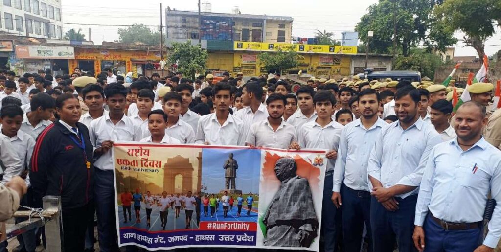 हाथरस 31 अक्टूबर । आज राष्ट्रीय एकता दिवस के अवसर पर सरदार वल्लभभाई पटेल की 150वीं जयंती के उपलक्ष्य में “Run for Unity” कार्यक्रम का आयोजन किया गया। इस अवसर पर सरस्वती विद्या मंदिर इंटर कॉलेज, लेबर कॉलोनी, हाथरस के अध्यापकों जिनमें प्रमुख रूप से रोहित शर्मा, हरेन्द्र सोलंकी, बृजेश कुमार बालाजी, हरीश शर्मा, रामप्रकाश शर्मा, अमर्त्य अग्निहोत्री एवं मीडिया प्रभारी सतेन्द्र प्रताप सिंह एवं छात्र-छात्राओं ने थाना हाथरस गेट के पुलिस कर्मियों के साथ मिलकर मैराथन दौड़ में भाग लिया। दौड़ की शुरुआत थाना हाथरस गेट गाँधी तिराहे से हुई जो अलीगढ़ मार्ग से होते हुए स्मार्ट बाजार हाथरस पर समाप्त हुई। कार्यक्रम का उद्देश्य छात्रों में राष्ट्रीय एकता, अखंडता और देशभक्ति की भावना को जागृत करना था। इस अवसर पर विद्यालय के प्रधानाचार्य लोकेन्द्र नाथ शर्मा, उपप्रधानाचार्य सतीश कुमार सारस्वत तथा शिक्षकों ने छात्रों का उत्साहवर्धन किया। थाना हाथरस गेट के पुलिसकर्मियों ने भी बच्चों के साथ दौड़ लगाकर संदेश दिया कि देश की एकता और सुरक्षा हम सबकी साझा जिम्मेदारी है। कार्यक्रम में छात्र-छात्राओं ने “एक भारत श्रेष्ठ भारत” के नारों से वातावरण गुंजायमान कर दिया।