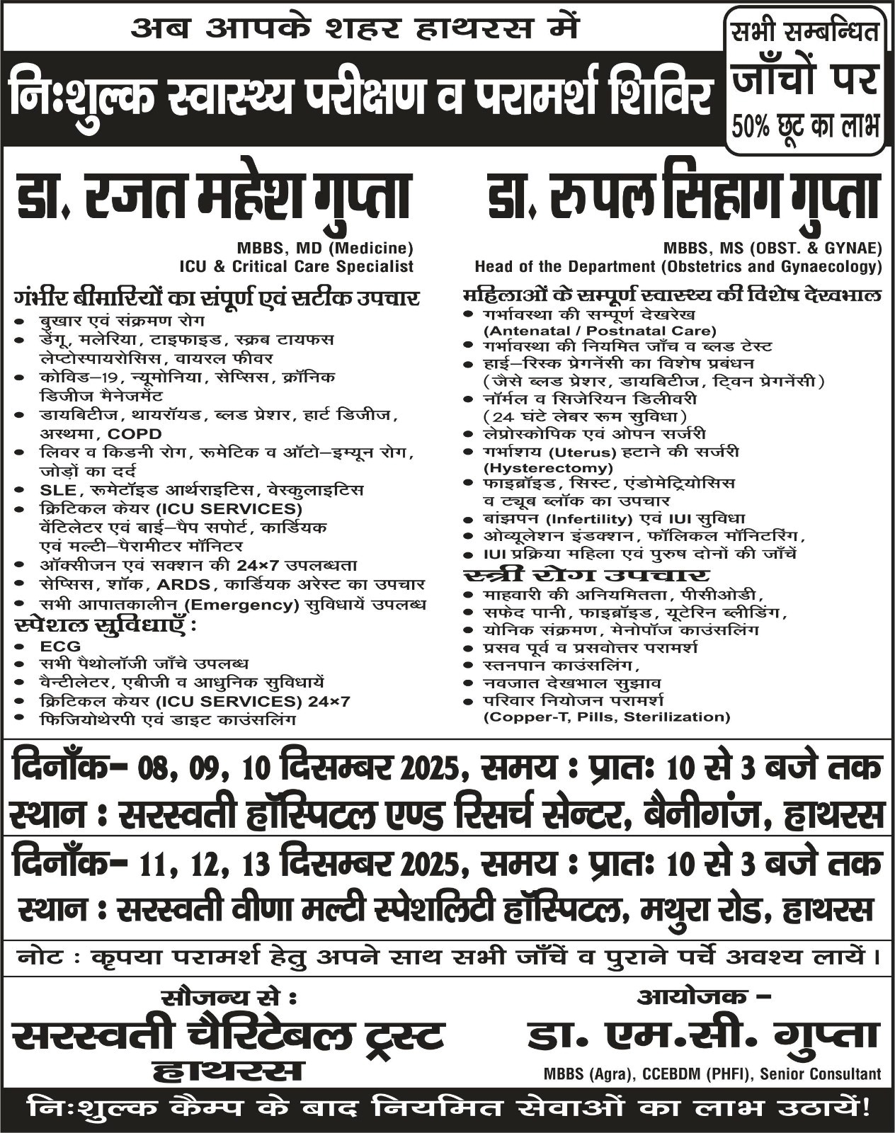 हाथरस 05 दिसंबर । शहर में नागरिकों के स्वास्थ्य को ध्यान में रखते हुए सरस्वती चैरिटेबल ट्रस्ट द्वारा निःशुल्क स्वास्थ्य परीक्षण व परामर्श शिविर का आयोजन किया जा रहा है। शिविर में सभी प्रकार की चिकित्सा जाँचों पर 50% की विशेष छूट भी प्रदान की जाएगी। इस स्वास्थ्य शिविर में डॉ. रजत महेश गुप्ता (MBBS, MD – ICU & Critical Care Specialist) तथा डॉ. रूपल सिहाग गुप्ता (MBBS, MS – Obstetrics & Gynaecology) द्वारा परामर्श दिया जाएगा। शिविर में गंभीर बीमारियों, स्त्री रोग, प्रसूति देखभाल, हार्मोनल समस्या, श्वसन रोग, मधुमेह, थायरॉयड, उच्च रक्तचाप सहित अनेक रोगों की जांच और उपचार मिलेगा। शिविर का पहला चरण 8, 9 और 10 दिसंबर को सरस्वती हॉस्पिटल एंड रिसर्च सेंटर बेनीगंज हाथरस में तथा दूसरा चरण 11, 12 और 13 दिसंबर को सरस्वती वीणा मल्टी स्पेशियलिटी हॉस्पिटल, मथुरा रोड, हाथरस में आयोजित किया जाएगा। दोनों स्थानों पर शिविर का समय प्रातः 10 बजे से दोपहर 3 बजे तक निर्धारित है। वरिष्ठ चिकित्सक डॉ. एम.सी. गुप्ता ने बताया कि यह शिविर आमजन के स्वास्थ्य संरक्षण और जागरूकता बढ़ाने के उद्देश्य से लगाया जा रहा है। उन्होंने लोगों से अपील की है कि शिविर में आते समय अपने सभी पुराने मेडिकल रिकॉर्ड व रिपोर्ट साथ लेकर आएँ। निःशुल्क शिविर के बाद नियमित चिकित्सा सेवाएँ भी रियायती दरों पर उपलब्ध रहेंगी।