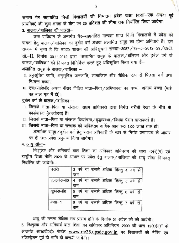 लखनऊ 08 जनवरी । उत्तर प्रदेश शासन ने शिक्षा का अधिकार (आरटीई) अधिनियम के तहत निजी स्कूलों में प्रवेश प्रक्रिया को लेकर नई व्यवस्था लागू की है। इस संबंध में अपर मुख्य सचिव पार्थ सारथी सेन शर्मा की ओर से सभी जिलाधिकारियों को विस्तृत दिशा-निर्देश जारी किए गए हैं। शासनादेश के अनुसार, आरटीई के अंतर्गत आवेदन करते समय बच्चों का आधार नंबर दर्ज करना अनिवार्य होगा। यह कदम निःशुल्क और अनिवार्य बाल शिक्षा का अधिकार अधिनियम, 2009 की धारा 12(1)(ग) के तहत लागू होगा, जिसके तहत गैर-सहायतित मान्यता प्राप्त निजी विद्यालयों में कक्षा एक या पूर्व-प्राथमिक कक्षा में अलाभित समूह और दुर्बल वर्ग के बच्चों को कम से कम 25 प्रतिशत सीटों पर प्रवेश दिया जाएगा। शासन ने यह भी स्पष्ट किया है कि जिन स्कूलों में पूर्व-प्राथमिक शिक्षा संचालित है, वहाँ यह व्यवस्था प्रारंभिक कक्षा से ही लागू होगी। चयनित बच्चों को कक्षा आठ तक निःशुल्क शिक्षा प्रदान की जाएगी। पूर्व में ऑनलाइन दस्तावेज़ सत्यापन और आधार नंबर बनाने में आ रही समस्याओं को ध्यान में रखते हुए शासन ने कुछ आंशिक संशोधन भी किए हैं। अब पूरी प्रवेश प्रक्रिया जिलाधिकारी और जिला शिक्षा परियोजना समिति की निगरानी में संपन्न कराई जाएगी। शासन का कहना है कि इस कदम से प्रवेश प्रक्रिया में पारदर्शिता बढ़ेगी और वास्तविक पात्र बच्चों को योजना का लाभ सुनिश्चित किया जा सकेगा।