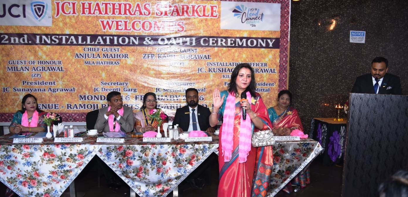 हाथरस 18 फरवरी । जेसीआई हाथरस स्पार्कल का दूसरा अधिष्ठापन समारोह बीते सोमवार को अलीगढ़ रोड स्थित एक रिजॉर्ट में हुआ, जिसमें गेस्ट ऑफ ऑनर के रूप में ZP मिलन अग्रवाल, इंस्टॉलेशन ऑफिसर ZVP कुशाग्र अग्रवाल, स्पेशल गेस्ट IPZP कपिल अग्रवाल रहे। जेसीआई हाथरस स्पार्कल की अध्यक्ष जेसी सीमा मित्तल ने जेसी सुनयना अग्रवाल को 2026 के अध्यक्ष पद का दायित्व सौंपा। तथा उन्हें कॉलर पहना कर शपथ ग्रहण कराई। सचिव पद जेसी दीप्ति गर्ग और कोषाध्यक्ष पद जेसी सीमा अग्रवाल को सौंपा गया। वाइस प्रेसिडेंट का पद जेसी मीनू अग्रवाल को सौंपा गया। सर्वप्रथम मंचासीन अधिकारियों और अतिथियों द्वारा गणेश के सामने दीप प्रज्ज्वलन किया गया। इसके पश्चात बाल कलाकार लवंशी अग्रवाल द्वारा गणेश वंदना प्रस्तुत की गई। इस अवसर पर जॉन ऑफिसर जेसी दीप्ति अग्रवाल और जेसी रुपेश गर्ग उपस्थित रहे। प्रोजेक्ट डायरेक्टर के रूप में जेसी शिवानी और जेसी नेहा मित्तल रही। कार्यक्रम का सफल संचालन जेसी अंजना गर्ग और शीतल अग्रवाल द्वारा किया गया। सभी सखियों के लिए जलपान की व्यवस्था की गई। सभी ने साथ में मिलकर हाउजी खेली। और खूब सारी सेल्फी ली। अंत में जेसीआई हाथरस स्पार्कल की सचिव जेसी दीप्ती गर्ग जी ने सभी का धन्यवाद किया।