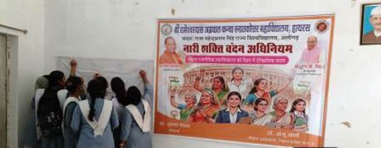 राष्ट्रीय सेवा योजना की छठवीं इकाई ने नारी शक्ति दीवार आयोजित किया। सहभागिता एवं जागरूकता बढ़ाने के लिए शिक्षकों और विद्यार्थियों ने कार्यक्रम में भाग लिया। सभी ने नारी शक्ति वंदन अधिनियम 2023 के समर्थन में दीवार पर अपने विचार लिखे और हस्ताक्षर कर समर्थन दिया। यह कार्यक्रम महिलाओं के सशक्तिकरण और लोकतंत्र में उनकी सक्रिय भूमिका को प्रोत्साहित करने की दिशा में एक महत्वपूर्ण पहल साबित हुआ। इसका आयोजन इकाई की कार्यक्रम अधिकारी भावना राज ने किया। स्वयसेवकों ने भी इन दिनों कार्यक्रमों में बढ़चढ़कर भाग लिया। इस अवसर पर प्रो. प्रमोद शर्मा, प्रो आरके शर्मा, डॉ. विकास शर्मा, डॉ. हैदर अली, डॉ. शगुफ्ता परवीन, डॉ. पूनम गुप्ता, डॉ. हिरदेश यादव, डॉ. तारिक अनवर देवाशीष चक्रवर्ती, अजय राठौर, मयंक जैन, राहुल देव, रामानंद मिश्रा, डॉ वाईपी गौर, डॉ संजय पाल, दीपिका गुप्ता आदि के अलावा सभी स्वयं सेवक उपस्थित रहे।