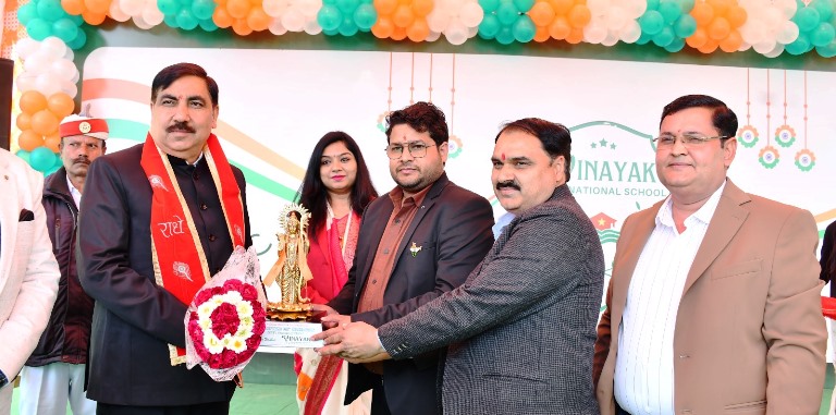 हाथरस 26 जनवरी । शहर के गणेश सिटी स्थित विनायक इंटरनेशनल स्कूल में 77वां गणतंत्र दिवस समारोह हर्षोल्लास, गरिमा एवं देशभक्ति के वातावरण में भव्य रूप से मनाया गया। कार्यक्रम का शुभारंभ मुख्य अतिथि एसडीएम सदर राजबहादुर सिंह द्वारा दीप प्रज्वलन एवं ध्वजारोहण कर किया गया। इस अवसर पर विद्यालय के अध्यक्ष के.के. चौधरी एवं डायरेक्टर हरेंद्र सिंह ने मुख्य अतिथि को दुपट्टा एवं प्रतीक चिन्ह भेंट कर सम्मानित किया। राष्ट्रगान की गूंज के साथ पूरा विद्यालय परिसर देशभक्ति के रंग में रंग गया।